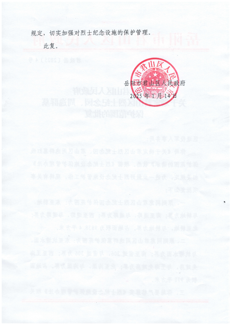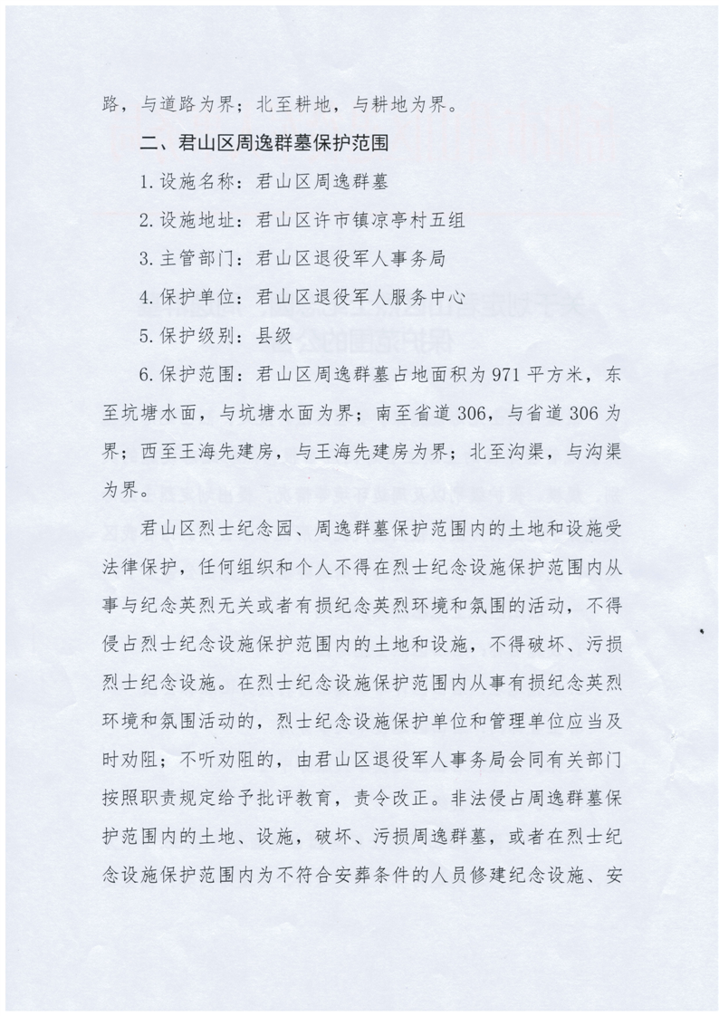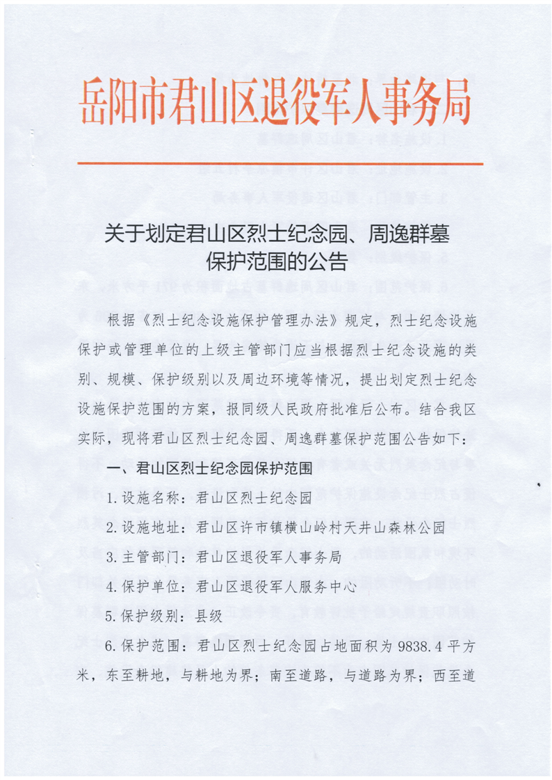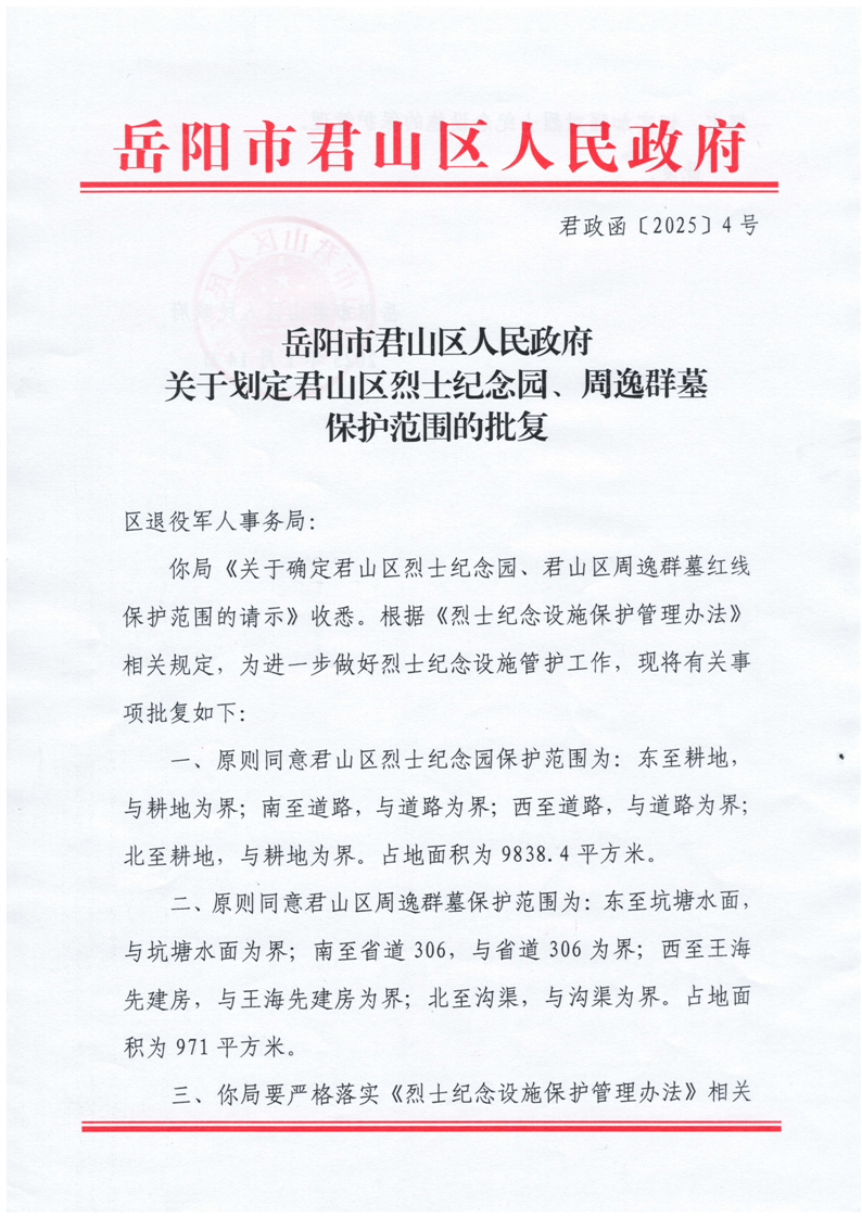 關(guān)于劃定君山區(qū)烈士紀(jì)念園、周逸群墓保護(hù)范圍的批復(fù)及公告