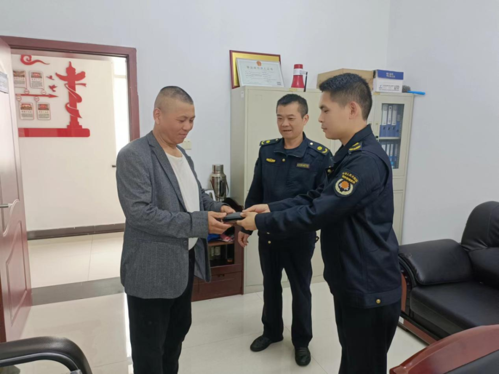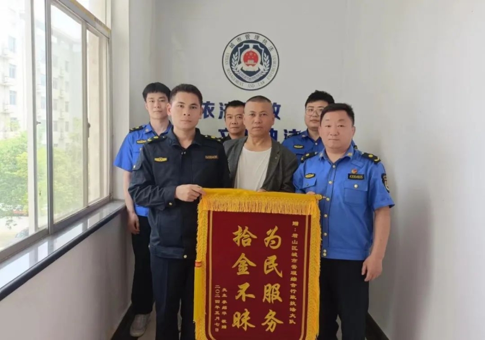 當(dāng)天,失主找到區(qū)城管局執(zhí)法大隊,將一面繡有“拾金不昧,為民服務(wù)”的錦旗送到這名執(zhí)法隊員蔡櫓的手中,對城管職工拾金不昧、樂于助人的善舉表示誠摯感謝。