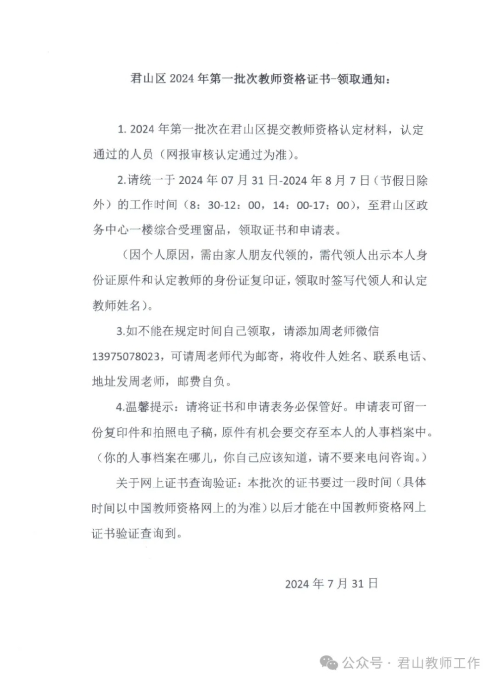 君山區(qū)2024年第一批次教師資格證書-領(lǐng)取通知