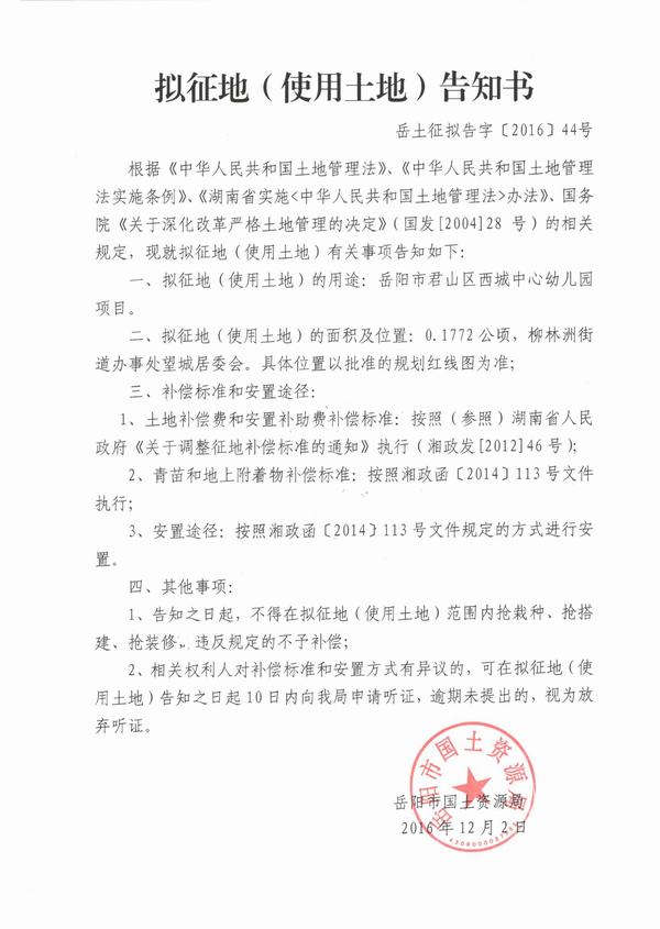 岳陽(yáng)市國(guó)土資源局?jǐn)M征地告知書(shū)|岳土征擬告字〔2016〕44號(hào)