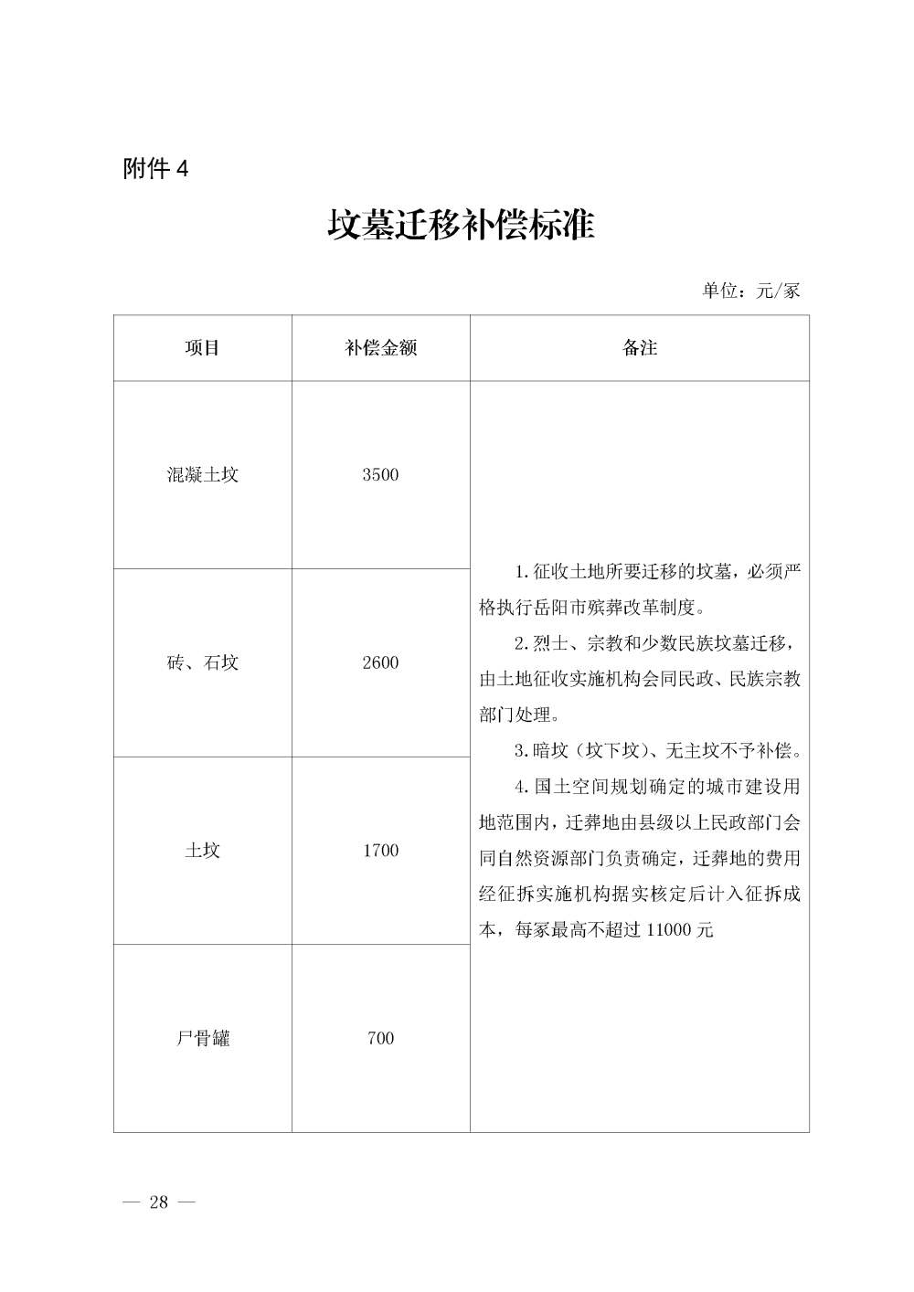 第二十八條 征收土地范圍內(nèi)的墳?zāi)剐枰w移的,由土地征收實(shí)施機(jī)構(gòu)發(fā)布遷墳公告,組織有關(guān)部門核實(shí)后按《墳?zāi)惯w移補(bǔ)償標(biāo)準(zhǔn)》(附件4)給予遷墳補(bǔ)償。