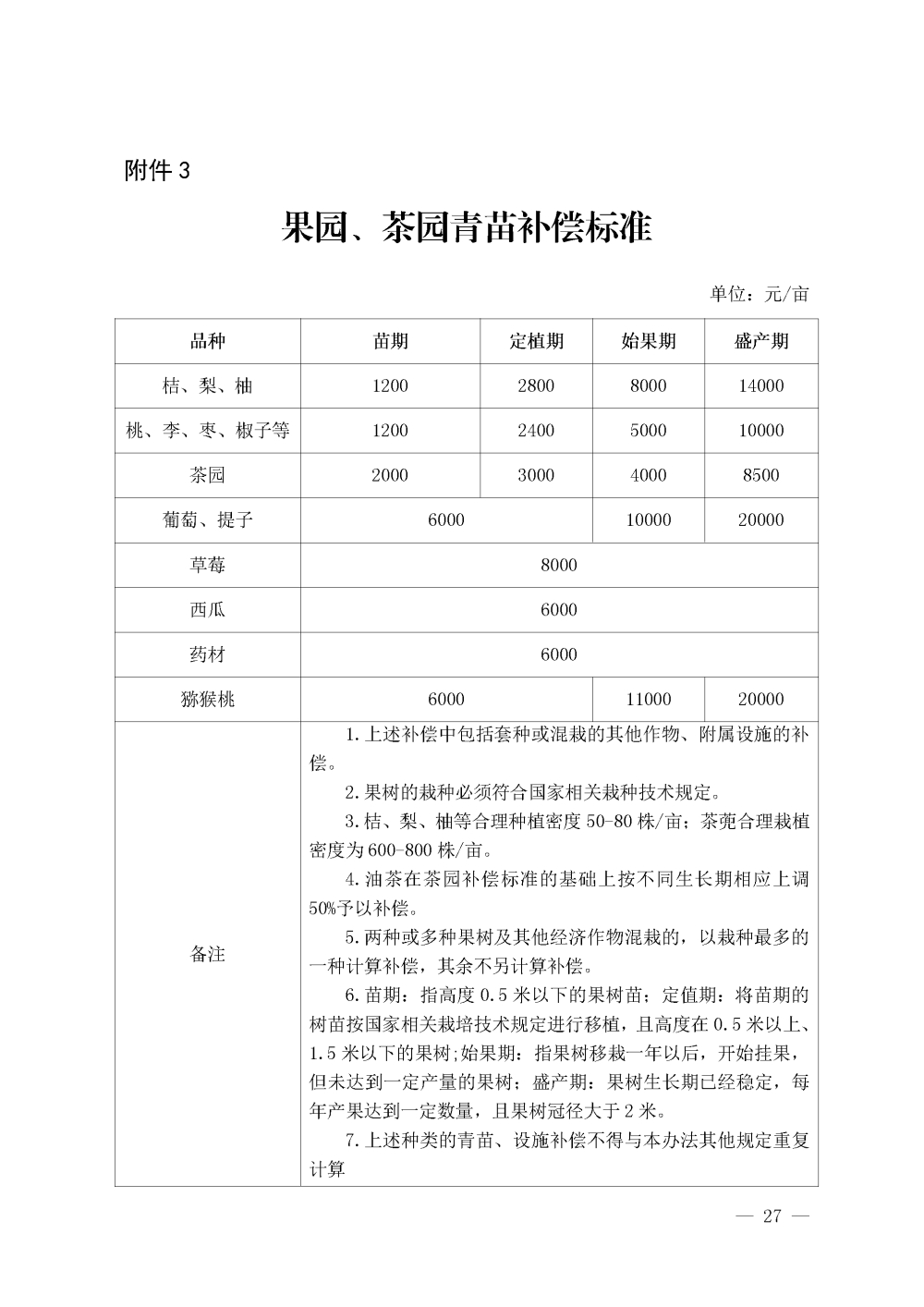 征收果園、茶園等青苗按《果園、茶園青苗補(bǔ)償標(biāo)準(zhǔn)》(附件3)給予補(bǔ)償。