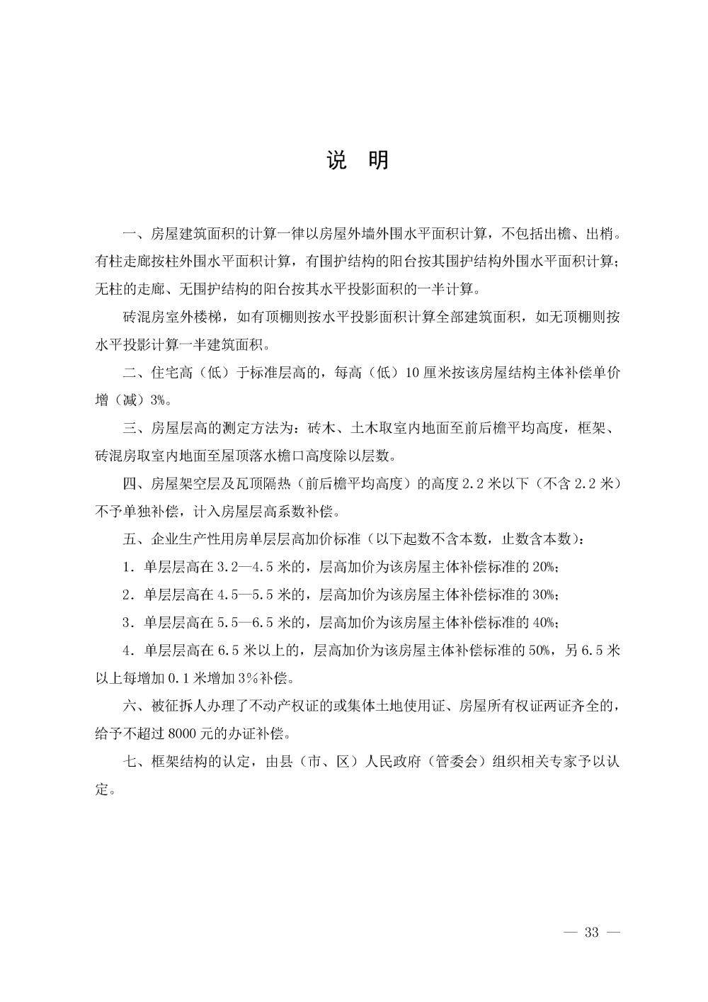 第三十八條 在征收土地預(yù)公告發(fā)布前依法辦理了設(shè)施農(nóng)用地備案手續(xù)的養(yǎng)殖用房,其養(yǎng)殖管理用房參照《住宅房屋結(jié)構(gòu)、裝飾裝修要求及補(bǔ)償標(biāo)準(zhǔn)》(附件5-1)同等結(jié)構(gòu)住宅房屋主體征收補(bǔ)償標(biāo)準(zhǔn)給予補(bǔ)償;養(yǎng)殖畜禽舍參照《偏雜屋結(jié)構(gòu)、設(shè)施要求及補(bǔ)償標(biāo)準(zhǔn)》(附件5-2)對(duì)應(yīng)等級(jí)給予補(bǔ)償。同時(shí),按照養(yǎng)殖用房合法建筑面積給予不超過200元/平方米的搬遷補(bǔ)償(含轉(zhuǎn)移費(fèi)、停產(chǎn)損失和設(shè)施補(bǔ)償?shù)龋a(bǔ)償后不再另行安置,不享受搬家費(fèi)、過渡費(fèi)和獎(jiǎng)勵(lì)。