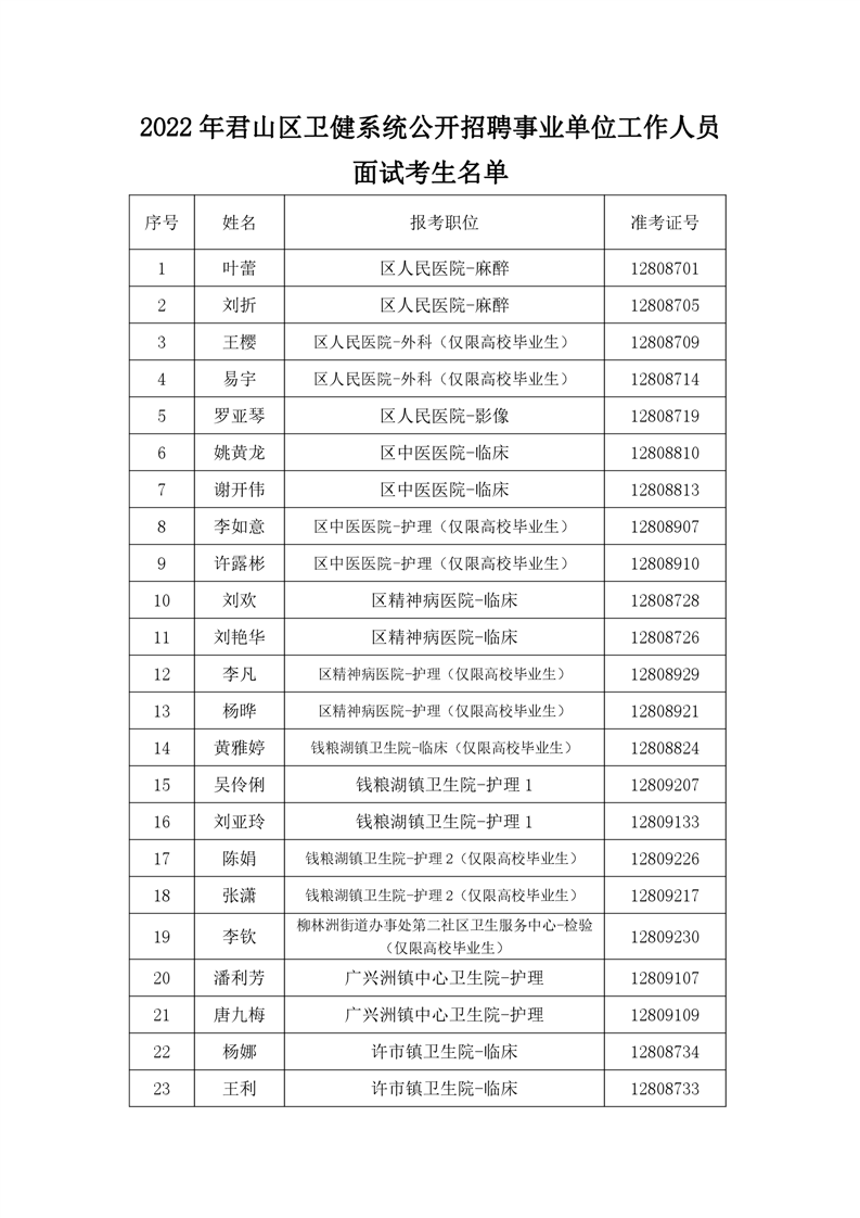 根據(jù)《2022年君山區(qū)衛(wèi)健系統(tǒng)公開招聘事業(yè)單位工作人員公告》要求,現(xiàn)將面試有關(guān)事項(xiàng)公告如下: