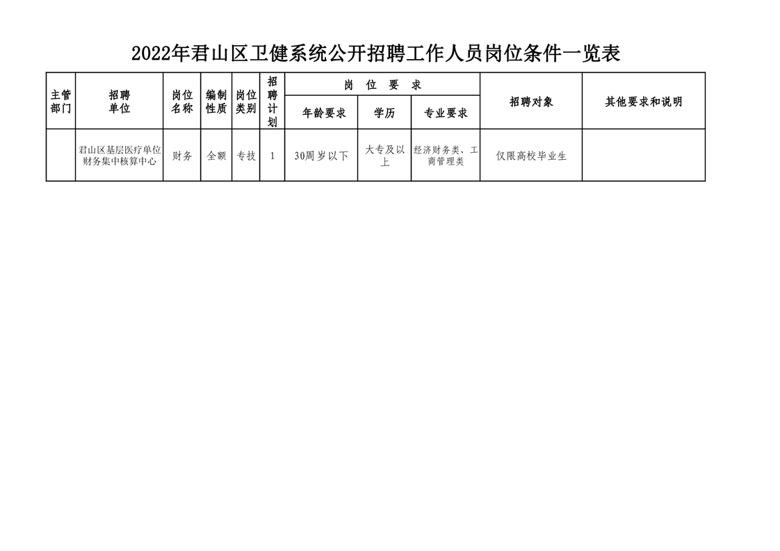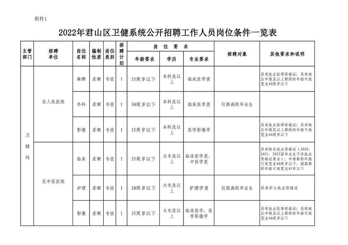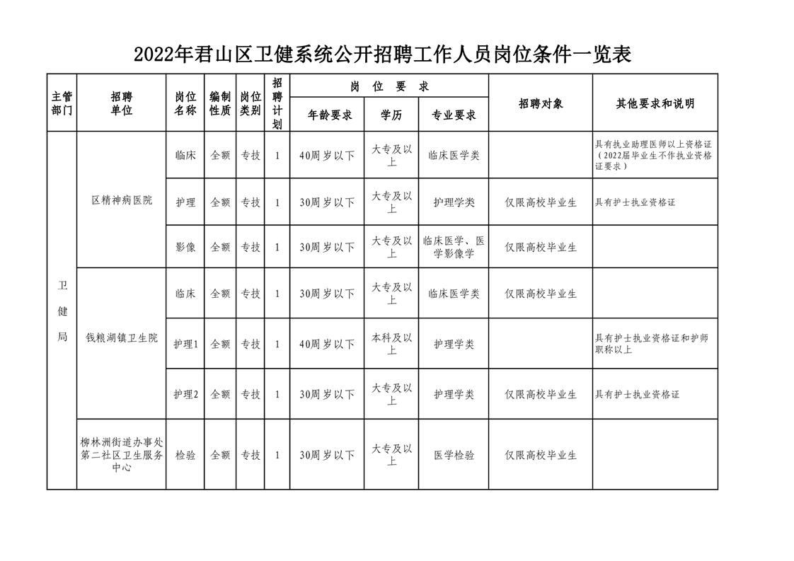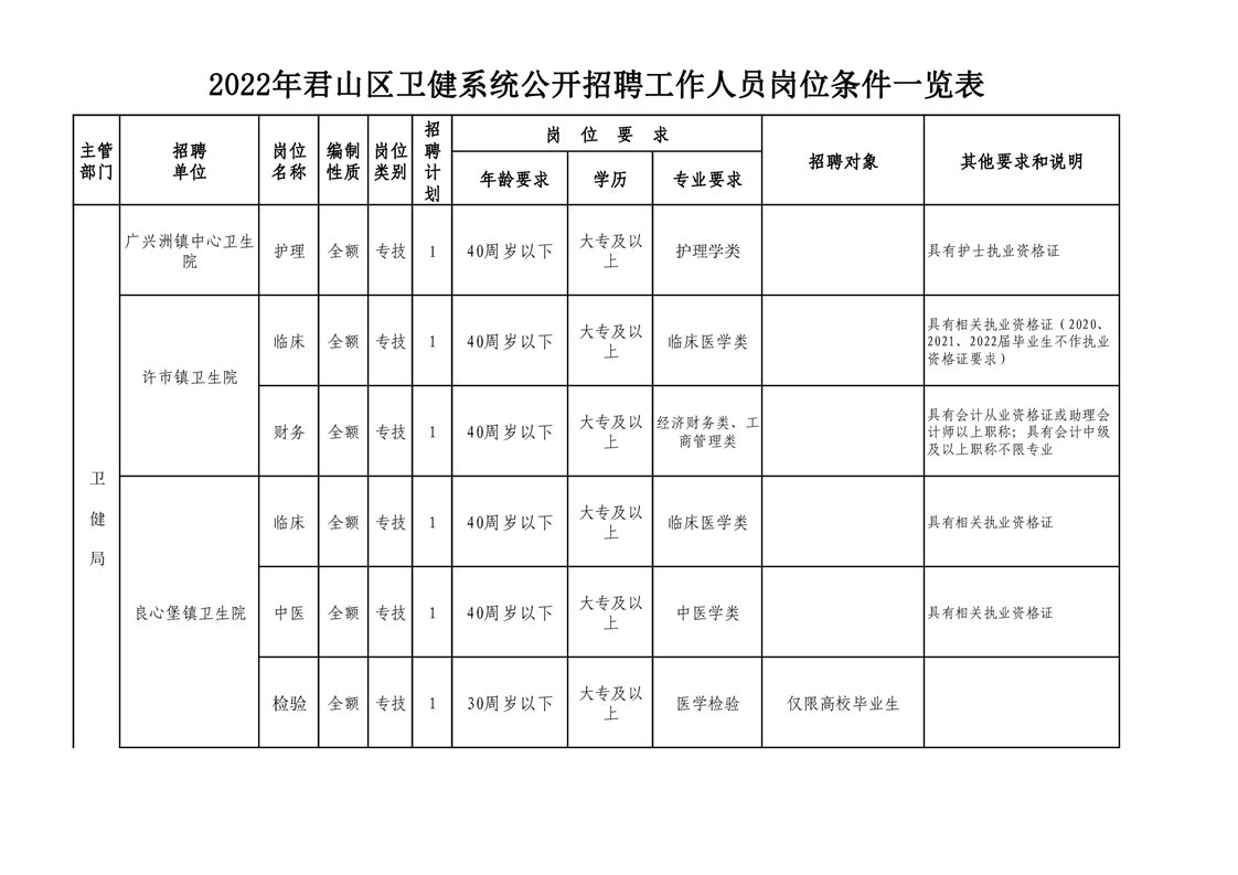 1.2022年君山區(qū)衛(wèi)健系統(tǒng)公開招聘工作人員崗位條件一覽表.xls;