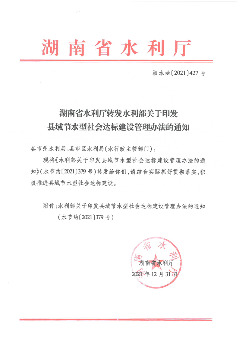 湖南省水利廳轉(zhuǎn)發(fā)水利部關(guān)于印發(fā)縣域節(jié)水型社會達(dá)標(biāo)建設(shè)管理辦法的通知