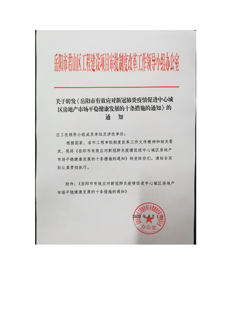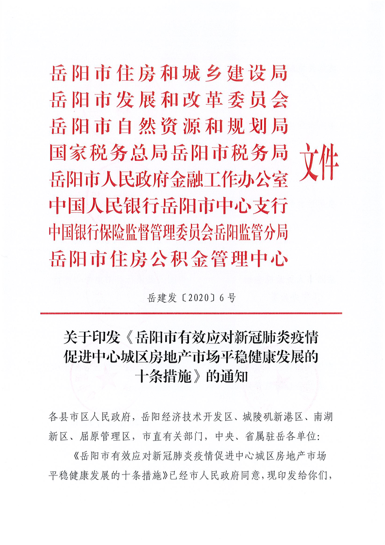 關(guān)于轉(zhuǎn)發(fā)《岳陽(yáng)市有效應(yīng)對(duì)新冠肺炎疫情促進(jìn)中心城區(qū)房地產(chǎn)市場(chǎng)平穩(wěn)健康發(fā)展的十條措施的通知》的通知