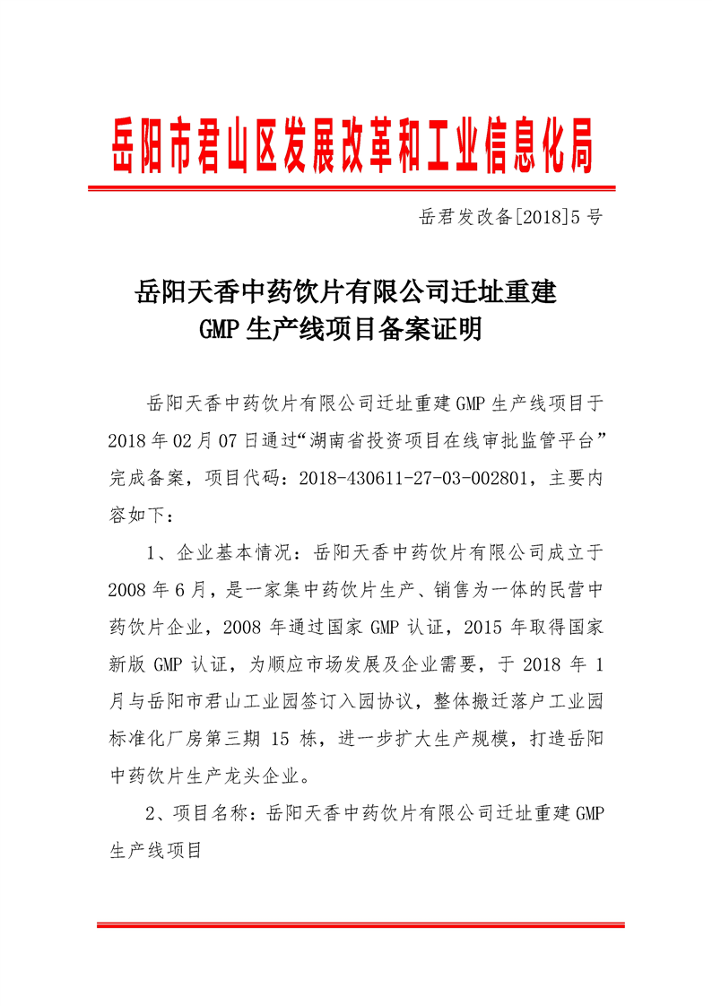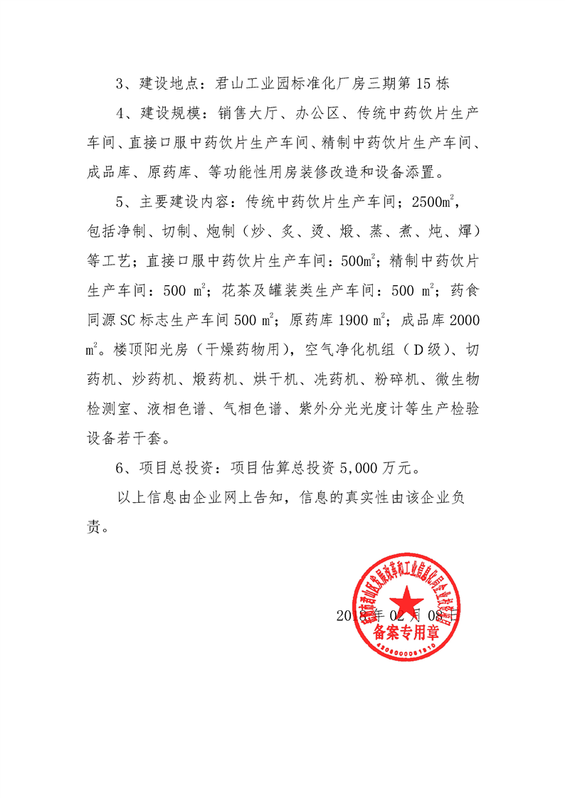 天香中藥飲片遷址重建GMP項(xiàng)目備案信息