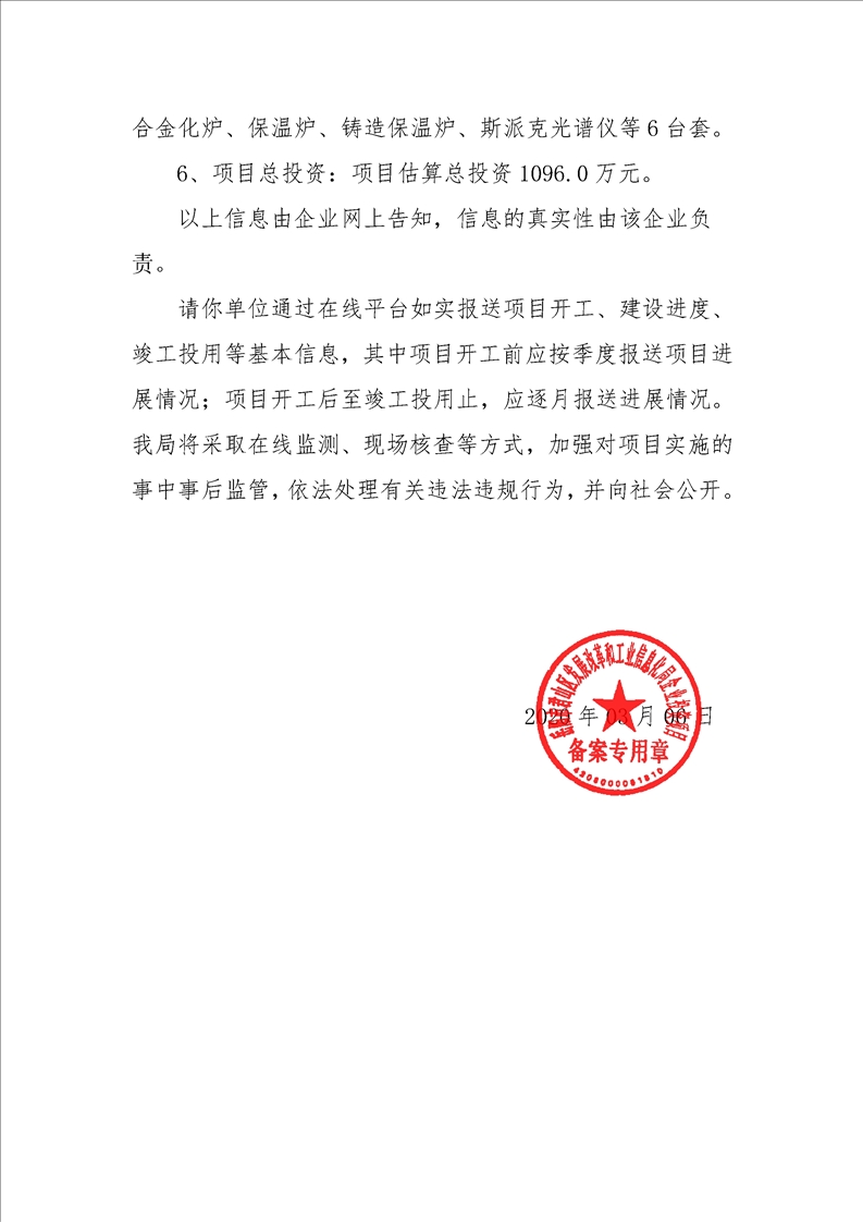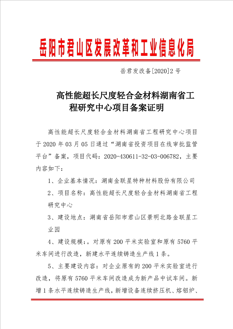 高性能超長尺度輕合金材料湖南省工程研究中心項目備案證明