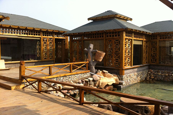 錦園農(nóng)家樂現(xiàn)就餐及配套面積20畝,其中菜地5畝、果園5畝、魚池8畝,建筑面積900余平方米,經(jīng)過設(shè)計(jì)師的專業(yè)打造,整個(gè)農(nóng)家樂顯得精致高雅,韻味十足。錦園目前共有九個(gè)廳房、四個(gè)室外茶座、一個(gè)接待大廳(兼會議室)。錦園現(xiàn)有員工22名,其中廚師四名(含一名高級營養(yǎng)師、一名高級廚師),可同時(shí)接待180就餐,具備一定的接待規(guī)模。錦園借鑒了漢代的建筑特色,以木結(jié)構(gòu)亭子為廳房主要建筑,亭子四周飾以漢式窗格,窗外木臺水池,綠化安排合理,地面滿鋪青石板,配上中式吊燈及現(xiàn)代LED燈帶,農(nóng)莊視覺效果良好。錦園還特意請書法家書寫了對聯(lián)、橫幅等,如門廳掛的清朝大才子紀(jì)曉嵐“一等人忠臣孝子、二件事讀書耕田”的對聯(lián),再加上錦園精心挑選的防古石缸石鼓及原木大臺,整個(gè)錦園充滿較為濃厚的中國傳統(tǒng)文化氣息。