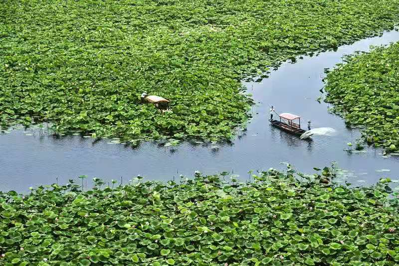 畫船撐入荷深處,碧荷連天兩相開。團(tuán)湖夏日正當(dāng)好,醉里花香入夢來。