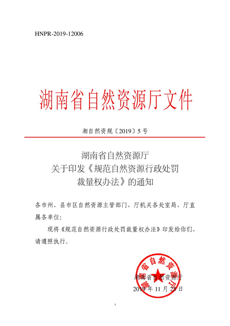 湖南省自然資源廳關(guān)于印發(fā)《規(guī)范自然資源行政處罰裁量權(quán)辦法》的通知湘自然資規(guī)〔2019〕5號(hào)