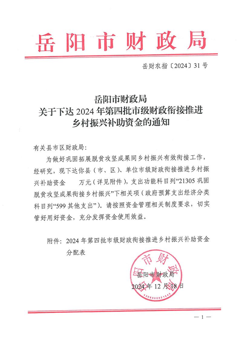 岳陽(yáng)市財(cái)政局關(guān)于下達(dá)2024年第四批市級(jí)財(cái)政銜接推進(jìn)鄉(xiāng)村振興補(bǔ)助資金的通知